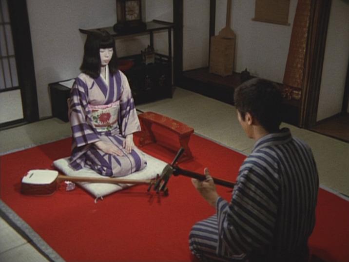 Shindo’s “Hymn” is one of many adaptions of Tanizaki’s classical novella ‘Shunkinsho’ (‘A Portrait of Shunkin’, 1933). The story tells of the adoration of Sasuke for his mistress, the blind samisen-teacher Shunkin, who treats him imperiously and subjects him to cruel beatings. After an unknown intruder probably one of her pupils, who seeks revenge for her cruel behaviour, pours boiling water on the sleeping Shunkin’s face, Sasuke blinds himself in order not to behold her disfigurement. Sasuke’s sacrifice, made in response to Shunkin’s tacit wish, seals their life-long relationship.